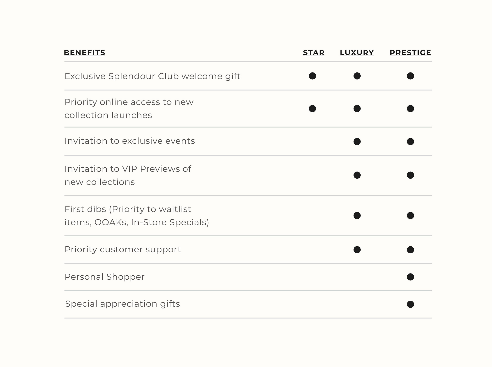 You'll receive a welcome gift, priority access to online launches, invitations to private events and VIP previews, early access to waitlist items and one-of-a-kind pieces (OOAKs*), in-store exclusives, priority customer support, a personal shopper service, and tier-based appreciation gifts—all thoughtfully extended based on your TMP Splendour Tier.