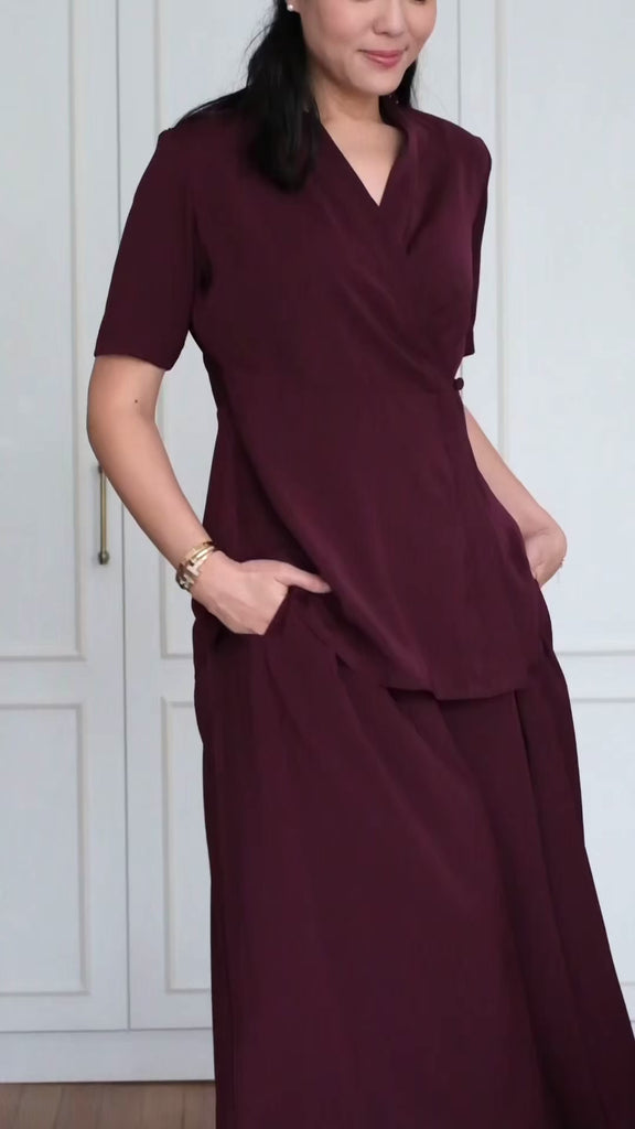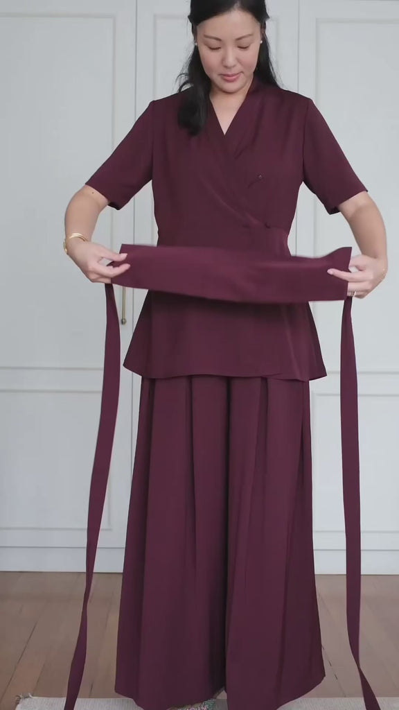 Effortlessly chic and endlessly versatile, the Adrienne Obi Pants Set is your go-to ensemble for polished comfort. Featuring a flattering wrap top with a V neckline and a matching wide-leg pant, this set comes complete with an adjustable obi belt that cinches the waist for a defined silhouette. You can also choose to wear the set without the obi belt for a relaxed, oversized look. Designed with practical pockets and crafted to move seamlessly with you, the matching pants transitions perfectly from the office to after work drinks with colleagues, offering modern sophistication in one easy, morning to night outfit.
