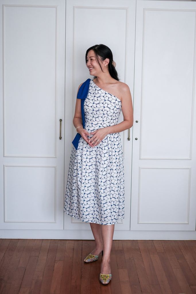 Elevate your wardrobe with the Carrie Lace Toga Dress, a delicate and demure piece crafted in elegant white and blue floral broderie lace. Designed in a flattering fit and flare silhouette, this midi-length dress exudes timeless charm and feminine grace. The standout toga-style neckline adds a modern twist, perfectly balanced by the soft romanticism of the intricate lace detailing. Made from breathable cotton eyelet fabric, the dress offers both comfort and texture, enhancing its airy, lightweight feel — ideal for warm-weather occasions. Finished with a striking cobalt bow at the shoulder, the Carrie Dress captures a sweet yet sophisticated aesthetic, perfect for garden parties, bridal showers, or any moment that calls for effortless elegance.