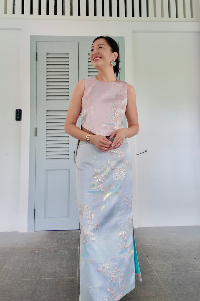 Elevate your wardrobe with our Chinoiserie Brocade Set, a stunning two-piece ensemble crafted from an extravagant pastel brocade, which brings a soft opulence that feels instantly dressy yet remains easy to mix and match. Designed with thoughtful curved lines along the waist and back, the set creates visually interesting shapes from every angle, highlighting the thought behind each piece. With an asymmetrical hi-low back top, you can wear the set together for a formal, statement-making look, or dress it down effortlessly with tailored shorts, pants, or even a simple white tee or singlet. Charming, refined, and full of styling possibilities, this is a standout ensemble that works beautifully across occasions.