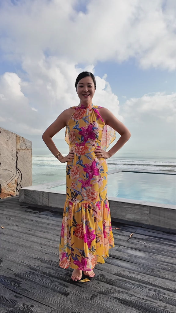 Those who love our Ellery Convertible Cape top are going to love this maxi cheongsam version. Turn heads in Lindsay, a standout piece this season. Choose from a vibrant hibiscus floral print set against a golden yellow base or a classic black. The silhouette flows effortlessly from a halter neckline into a cinched waist with zipper cut outs for a peek-a-boo moment and finishing in a graceful tiered skirt for added movement. The pièce de résistance is its detachable chiffon cape — wear it draped for a cold shoulder moment and for more arm coverage, or remove it for a cleaner look, giving you two distinctive looks in one versatile piece.