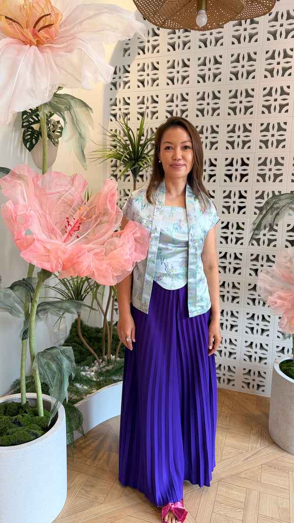 Elevate your wardrobe with the Mira Kebaya Top Set in Teal Brocade — a stunning two-piece ensemble that reimagines heritage with a refined modern touch. This kebaya top set features a beautifully crafted outer kebaya top paired with a tailored inner piece designed to flatter the silhouette. The ensemble is made from an exquisite ice blue brocade, offering a luxurious texture that blends traditional elements with contemporary touches. The inner slip is thoughtfully constructed with an exposed back zipper that zips up easily and with a longer dropped hem in front to give you extra coverage over the mid-drift. Wear each piece on its own or together for the perfect festive pairing.