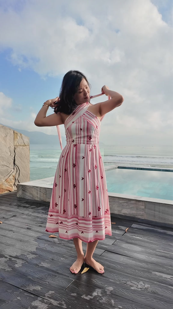 Our favourite Rhea is back, this time showcasing a soft, lightweight striped cotton linen with charming floral embroidery. A halter neckline highlights the shoulders while the fit and flare silhouette flatters every frame. Loved by so many of our customers, we have added our zipper cut outs to this crowd favourite to truly make it versatile for any occasion. Easily paired with flats or heels, you'll feel absolutely feminine and girly in this number.
